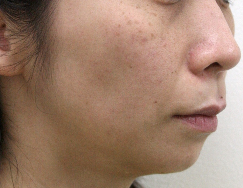 頬の脂肪がリフトアップしほうれい線を目立たなくし、同時にフェイスラインと首のたるみも改善しています。サーマクールの特徴は高周波により真皮層やさらに深い部分の脂肪層に安全に熱を与えることです。 |